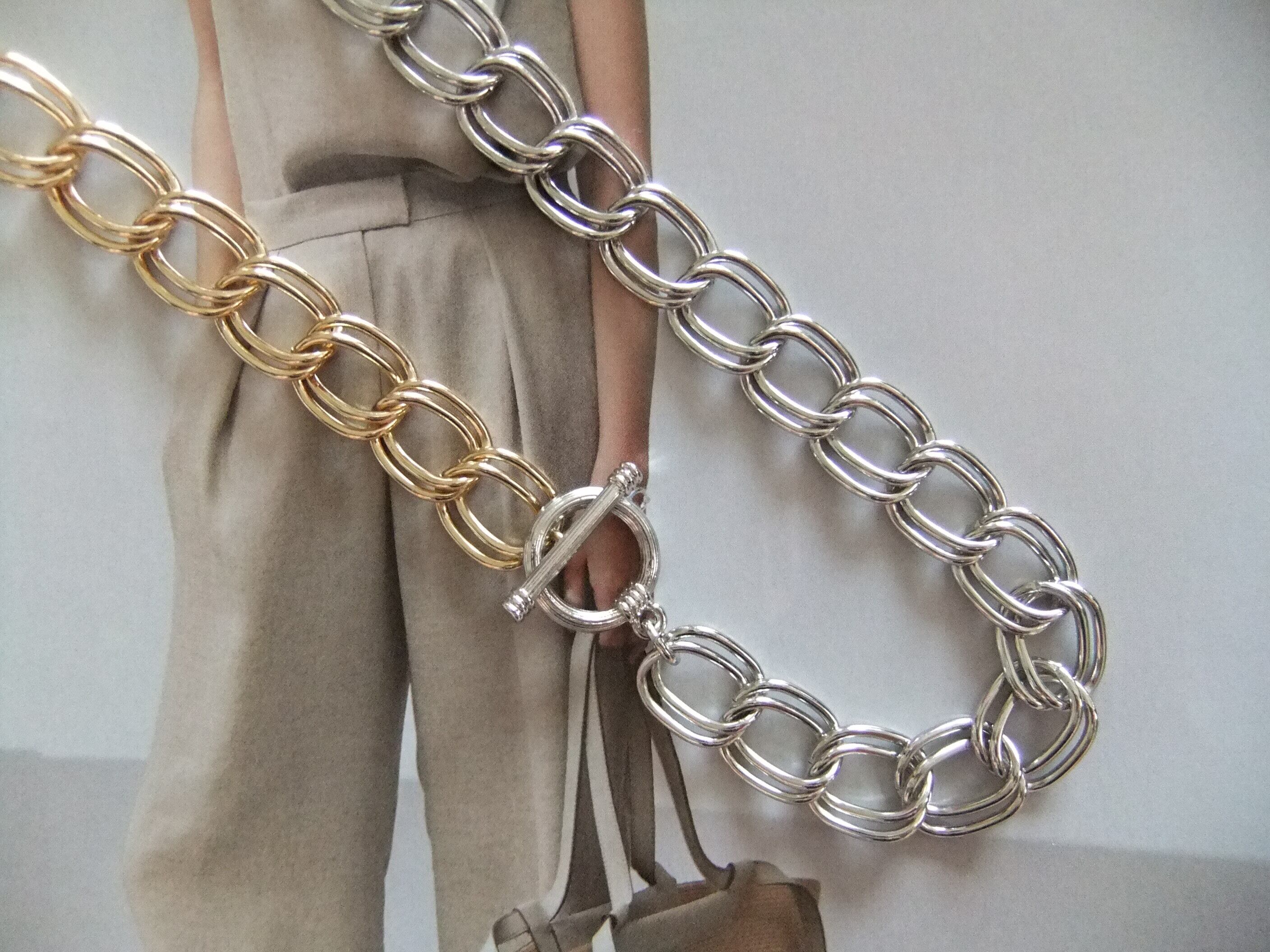 2重リングのシルバーとゴールドのチェーンを合わせ、マンテルで留めます。前にする色で