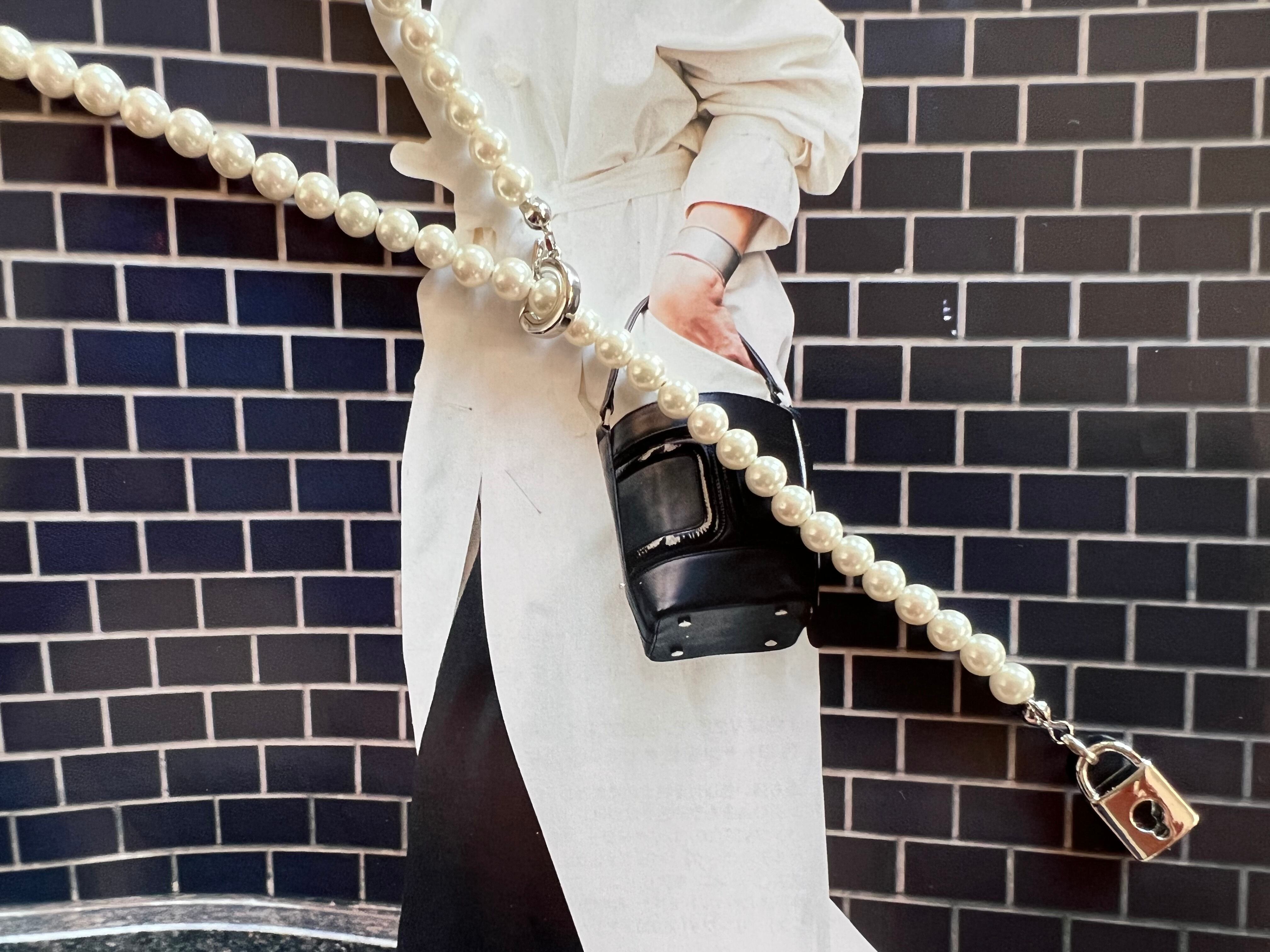 中位の大きさのパールを使っています。好きな長さのパールとパールの間で金具を留めます。Y字デザインにして先端の鍵チャームを垂らしてもいいし、チャームを後ろにして留めても。