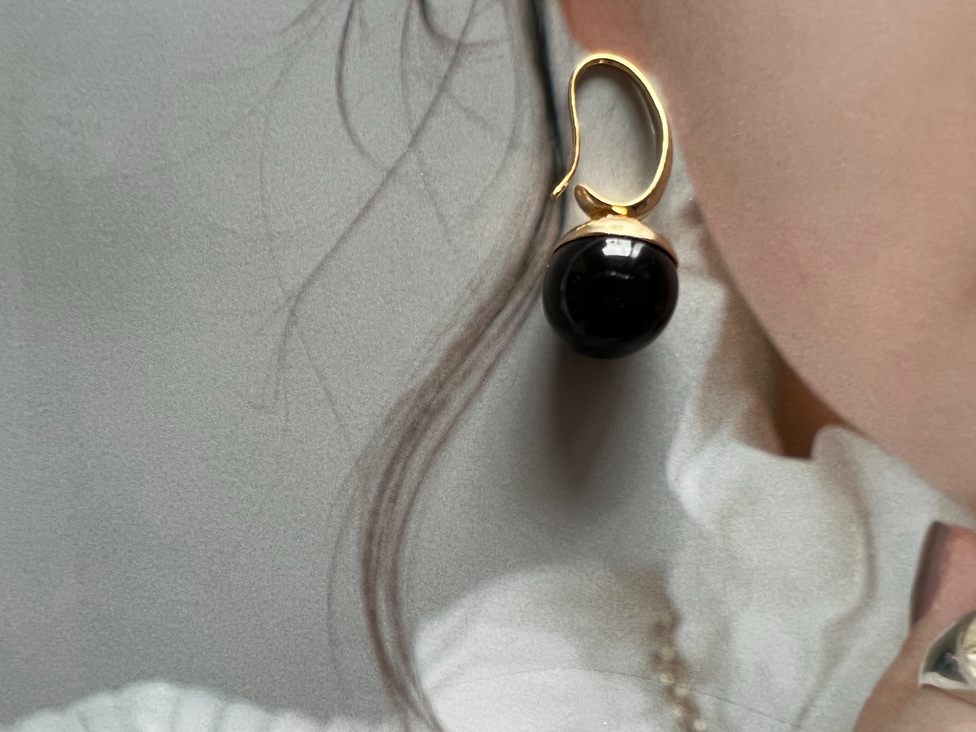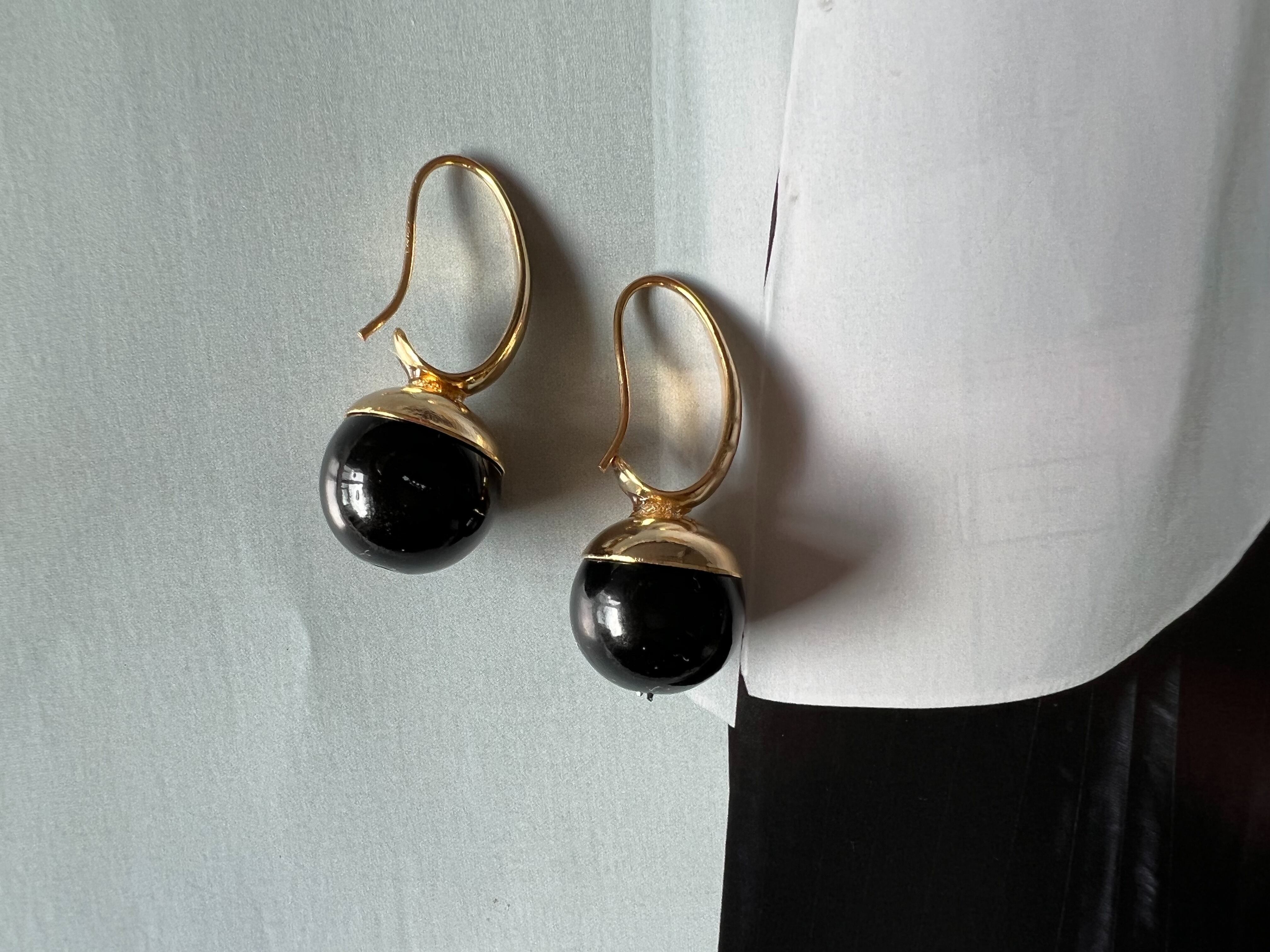 ブラックラウンドビーズにゴールドキャップをかぶせ、ロングフックピアスにつけました。