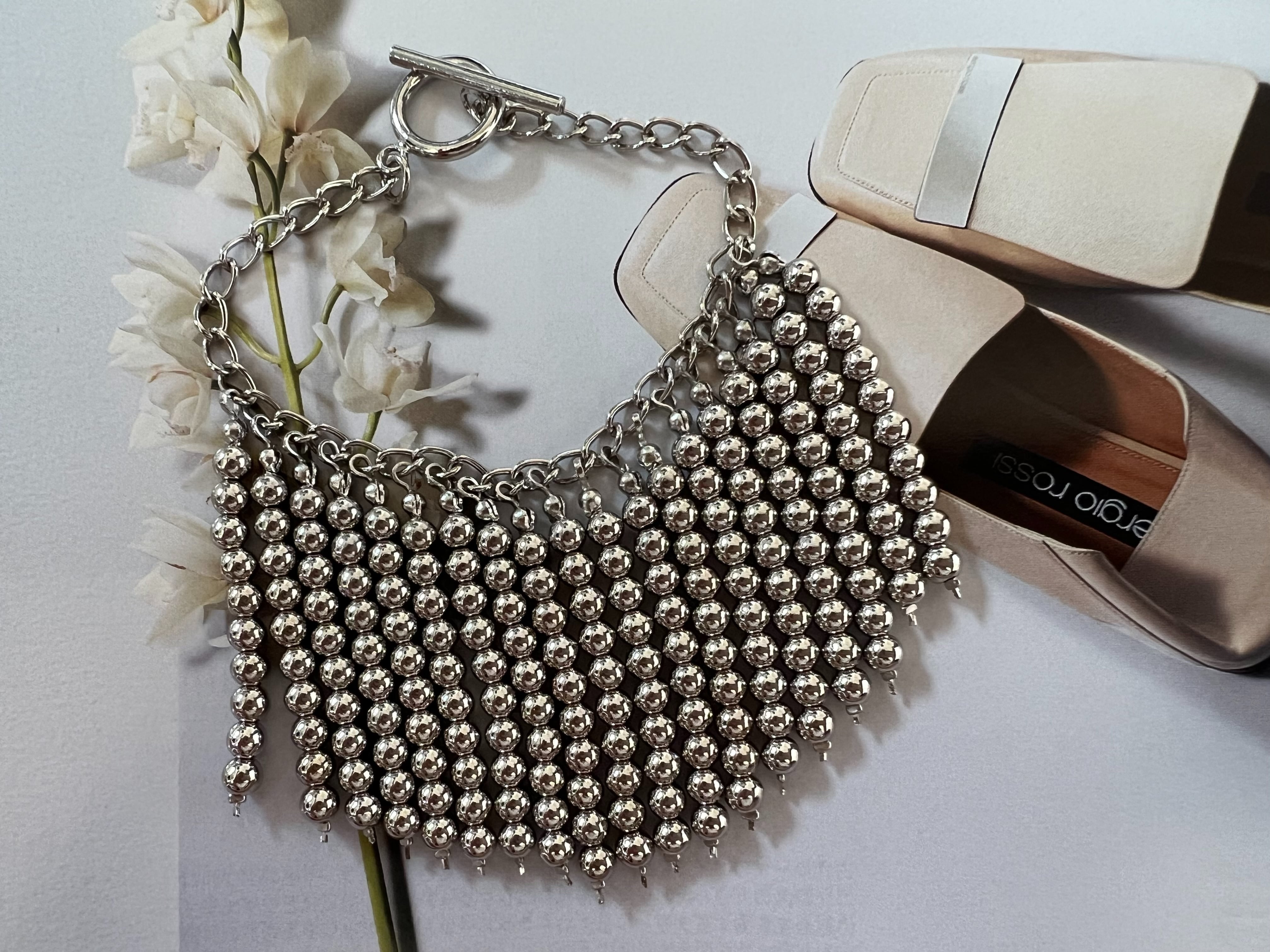 シルバーメタルビーズを並べたものをチェーンにつけて、フリンジデザインにしました。しゃらしゃら揺れて動きがあります。マンテルで留めます。