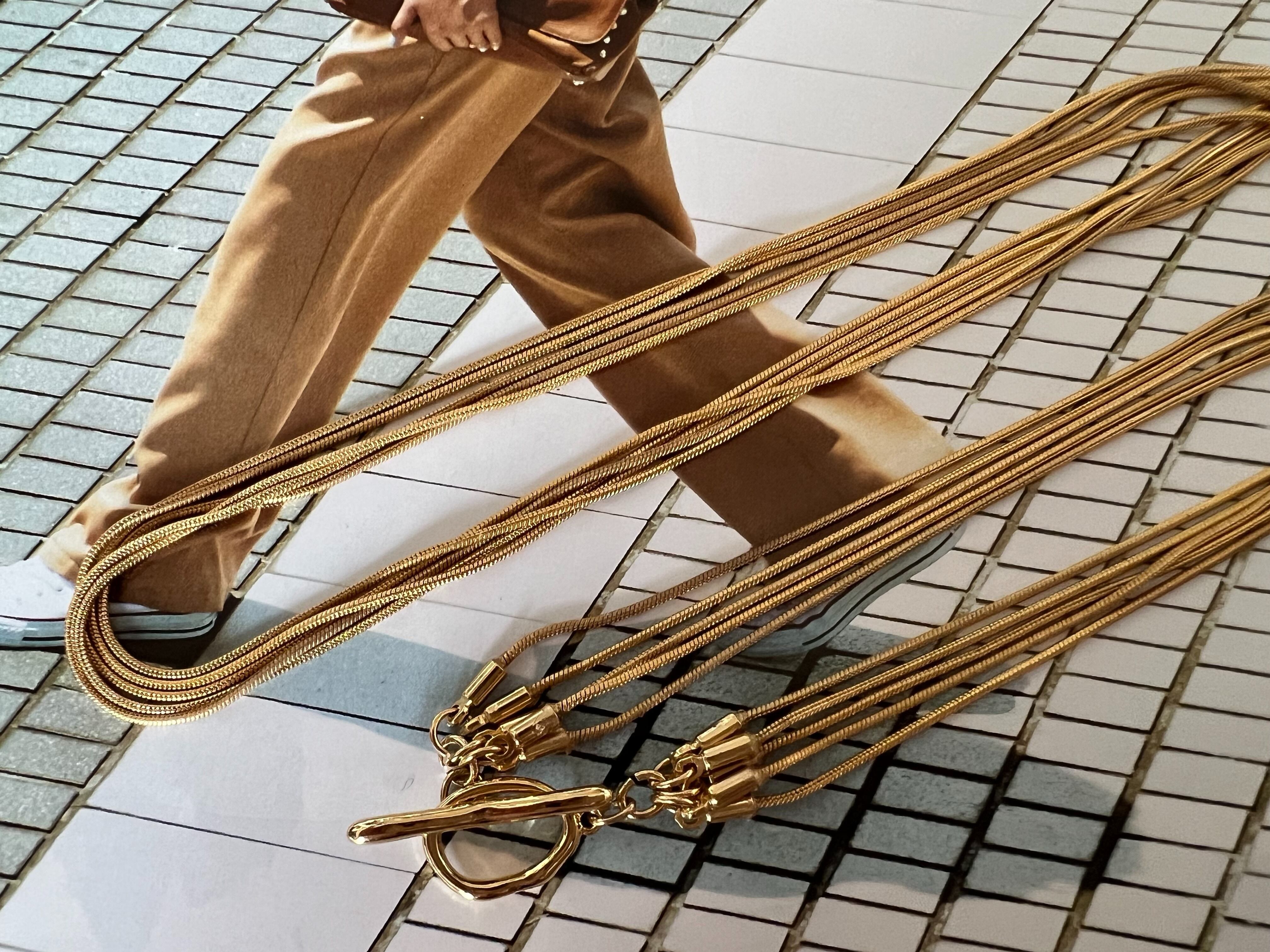シンプルなゴールドチェーンを5連にした胸辺りの長さのネックレスです。キラキラしすぎてないので普段使いに出来ます。